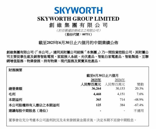 近日中金优配,创维集团披露2025年中期业绩显示,集团营业收入达362.64亿元,同比增长20.3%,创历史同期新高。